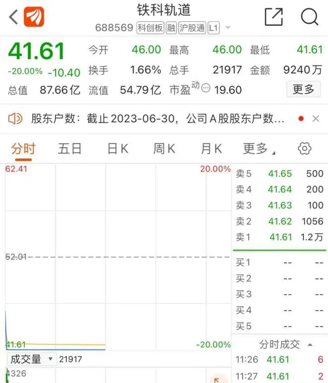 今日上午,铁科轨道开盘股价大跳水。截至发稿,铁科轨道封死跌停,股价报41.61元/股。