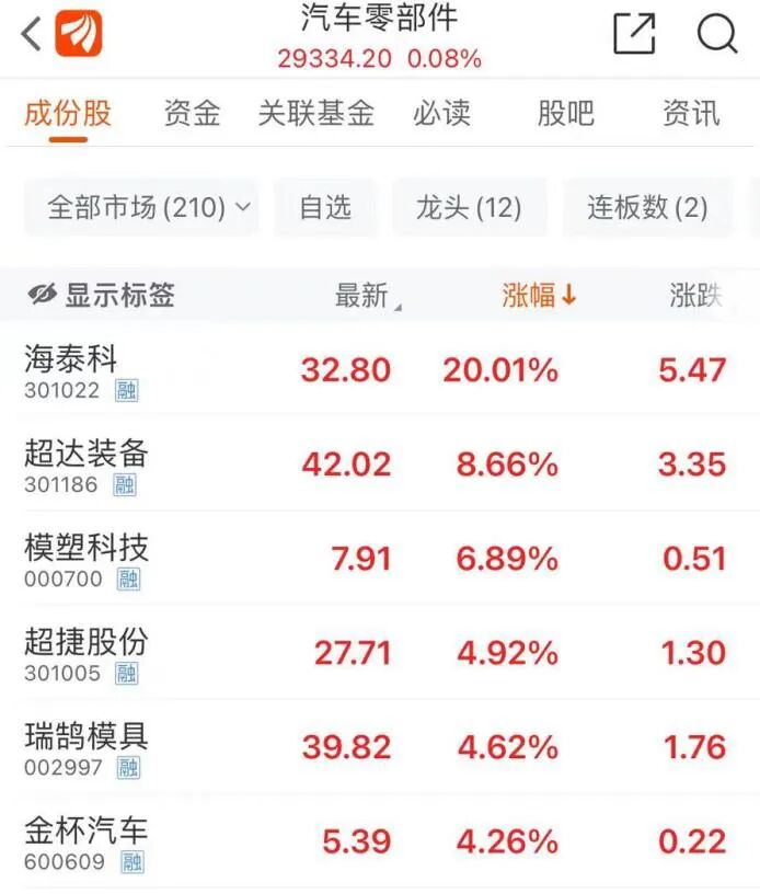 早盘,汽车零部件概念拉升,海泰科20%涨停,模塑科技、超捷股份、金杯汽车等跟涨。