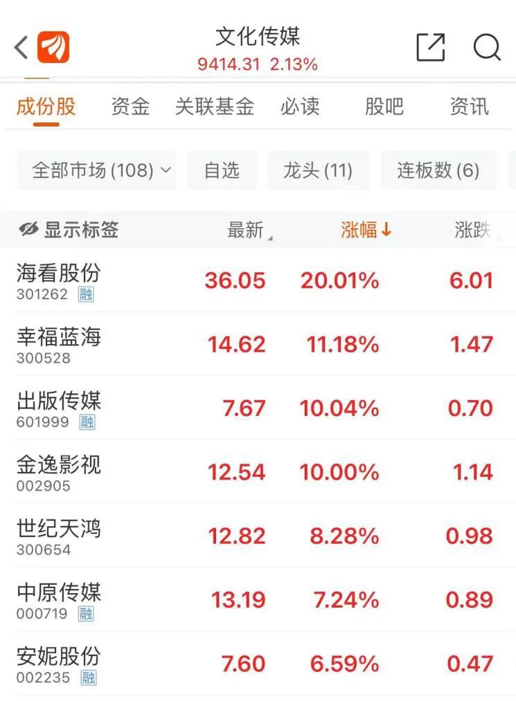 今日上午,传媒影视股持续走高,海看股份20%涨停,幸福蓝海涨超10%,出版传媒、金逸影视涨停。