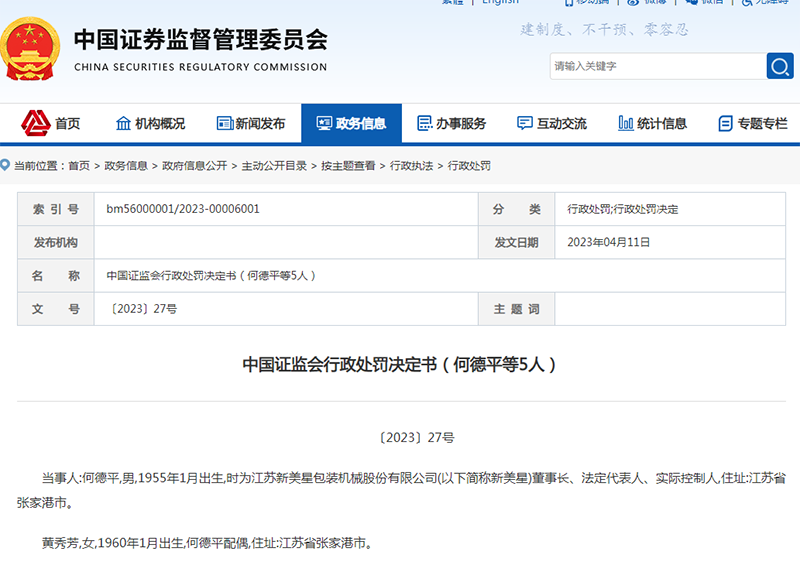 证监会近日公布的一则行政处罚决定书显示,新美星董事长、法定代表人、实际控制人何某平等5人借市值管理之名操纵新美星股票,非法获利近5000万元,最终被罚没9567.11万元。