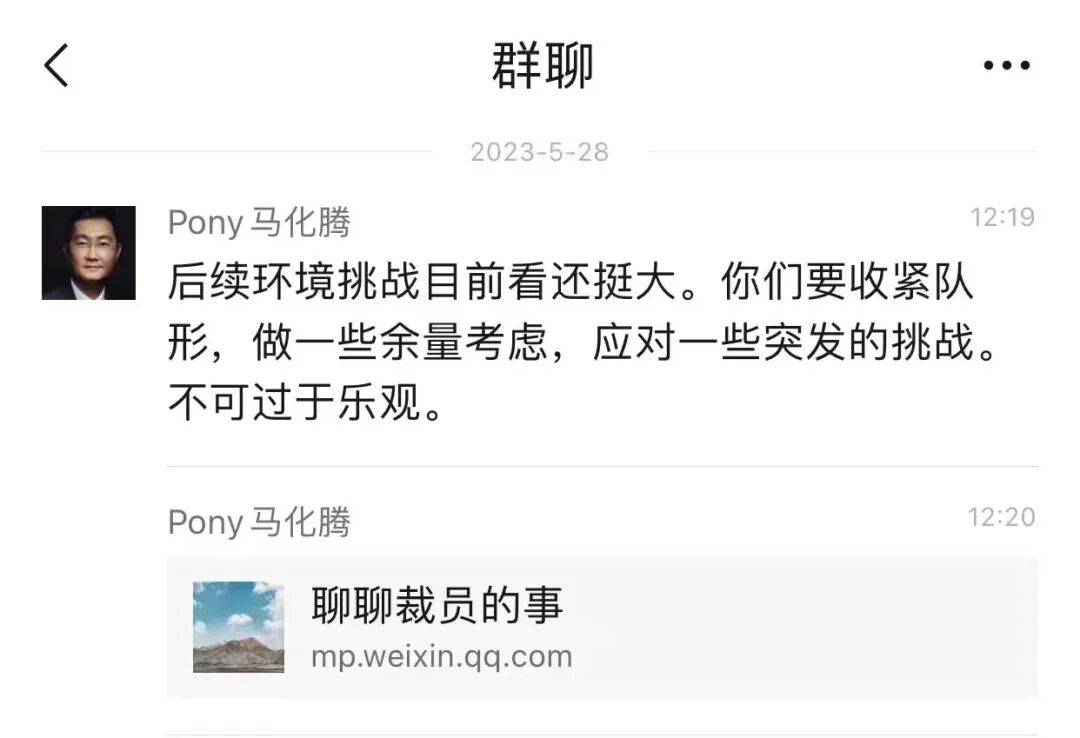 6月2日有消息传出,腾讯创始人、董事局主席马化腾在一组群聊中转发一篇文章时表示:“后续环境挑战目前看还挺大。你们要收紧队形,做一些余量考虑,应对一些突发的挑战。不可过于乐观。”