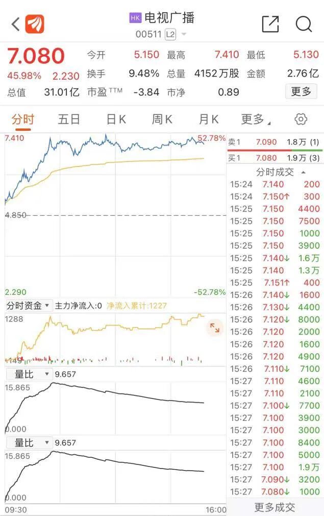 今日,TVB母公司电视广播放量大涨,盘中几度涨幅超过50%,截至发稿涨45.98%,报7.08港元/股,成交额超2.76亿港元。