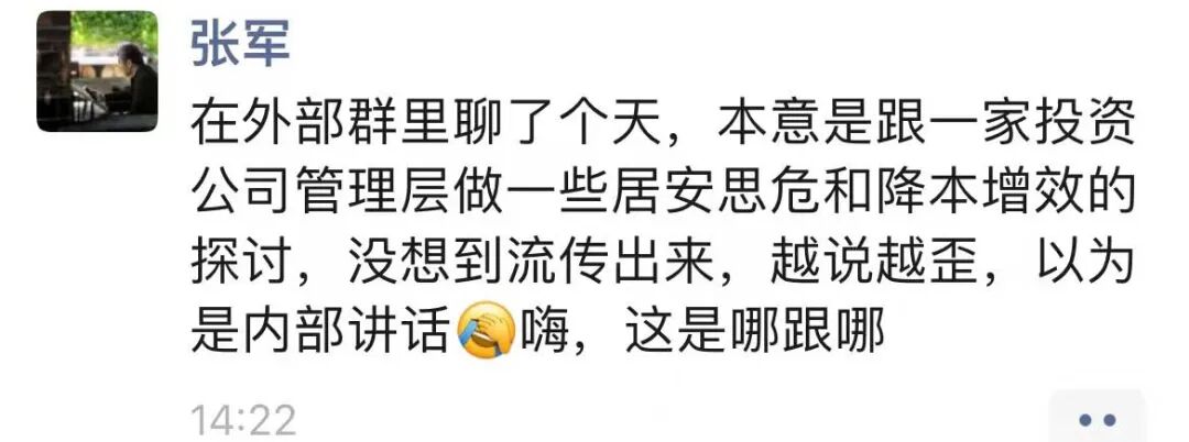 事情发生后,腾讯集团公关部总经理张军发布微信朋友圈澄清:“在外部群里聊了个天,本意是跟一家投资公司管理层做一些居安思危和降本增效的探讨,没想到流传出来,越说越歪,以为是内部讲话。嗨,这是哪跟哪。”