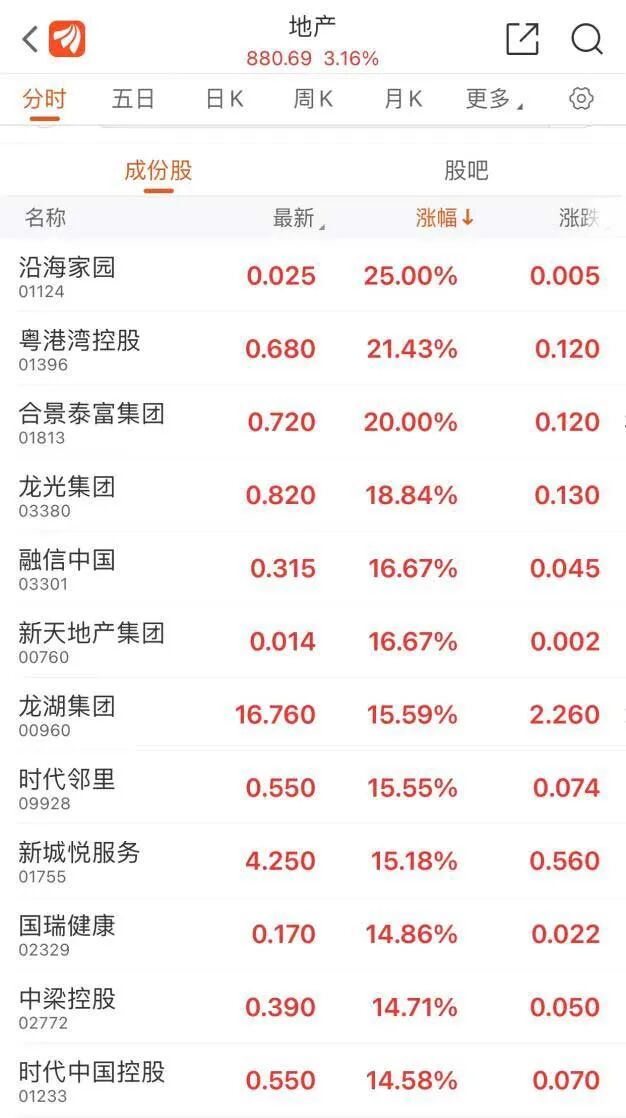 今日港股地产股强势大涨,带动物业管理股集体走高,截至发稿,龙光集团涨18.84%,融信中国涨16.67%,龙湖集团涨15.59%,新城发展涨14.49%,融创服务涨13.82%,碧桂园服务涨12.61%,融创中国涨10.83%。