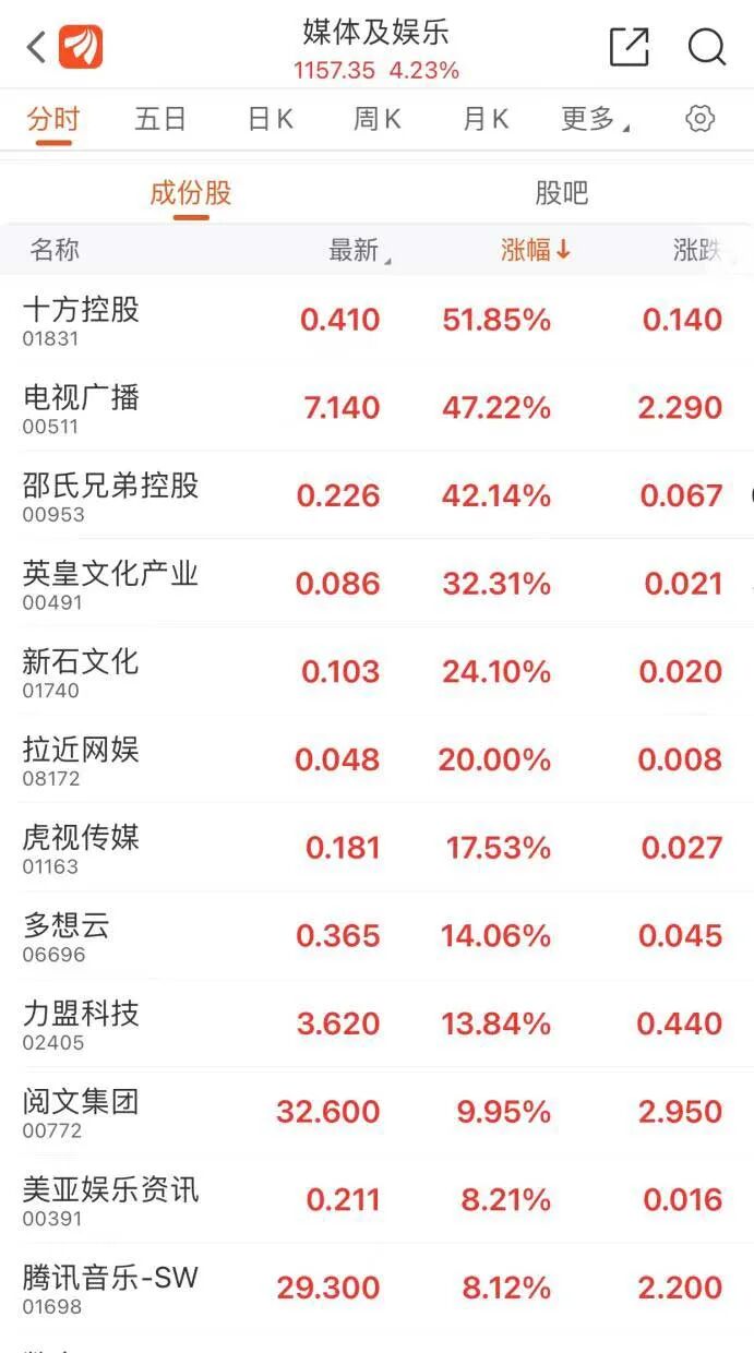 受电视广播大涨影响,港股文娱板块全线走高。十方控股涨51.85%,邵氏兄弟控股涨42.14%,英皇文化产业涨32.31%,虎视传媒涨17.53%,阅文集团涨9.95%,腾讯音乐-SW涨8.12%。