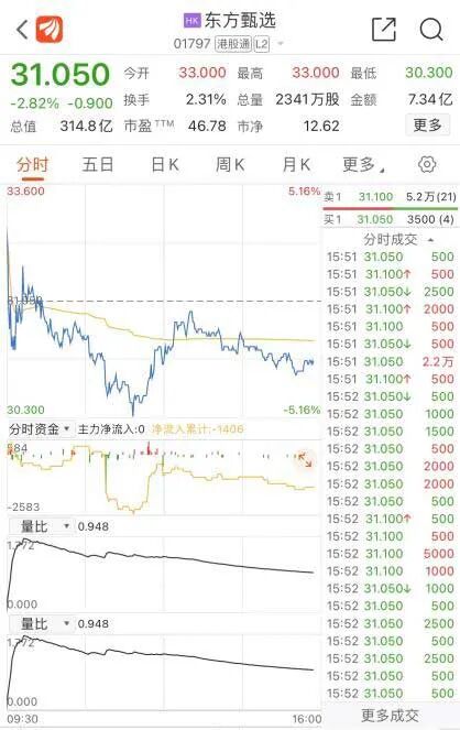 尽管多数与电商相关的公司今日都因“618”电商购物节热度大涨,但同为直播带货概念的东方甄选却意外走低。截至发稿,东方甄选跌2.82%。