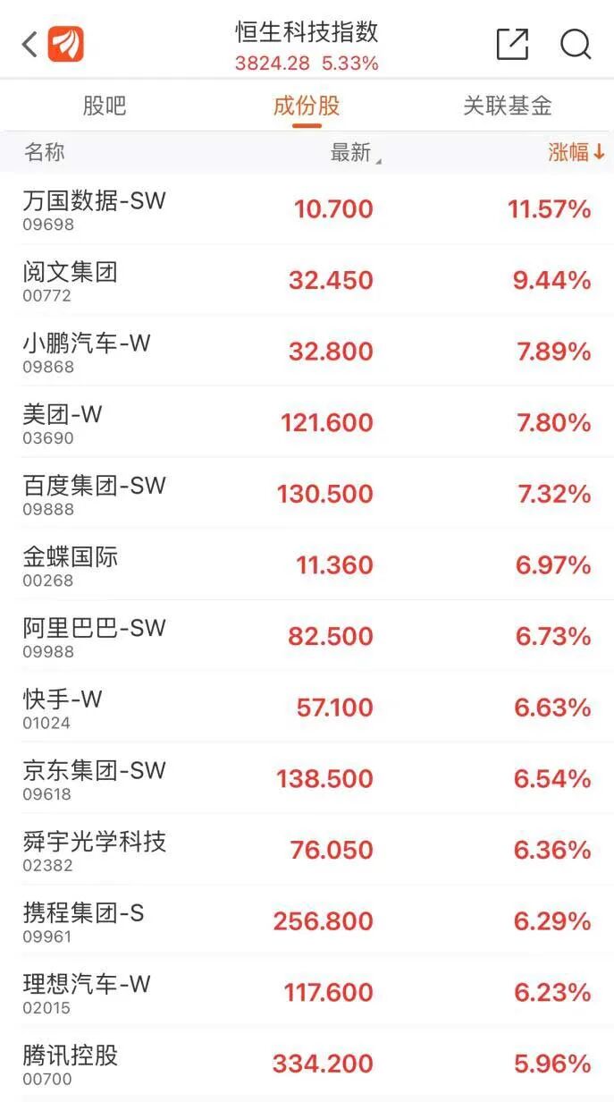 今日恒生科技指数成分股集体狂欢,截至收盘,万国数据-SW涨11.57%,阅文集团涨9.44%,美团-W涨7.8%,阿里巴巴-SW涨6.73%,快手-W涨6.63%,京东集团-SW涨6.54%,腾讯控股涨5.96%。