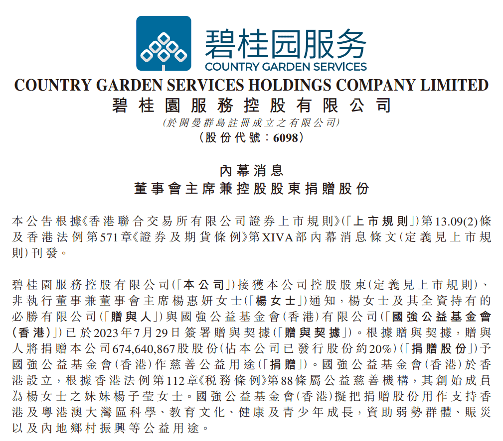 7月30日晚间,碧桂园服务发布公告称,公司控股股东、非执行董事兼董事会主席杨惠妍将向国强公益基金会(香港)有限公司捐赠其持有的约6.75亿股碧桂园服务股份作慈善公益用途。捐赠的股份占碧桂园服务已发行股份约20%,若按公告披露前最后一个交易日(7月28日)收市时碧桂园服务的总市值322.14亿港元计算,该笔捐赠股份价值约64.43亿港元。
