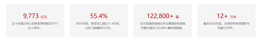 2022年,华为研发费用支出占全年收入的25.1%,近十年累计投入的研发费用超过人民币9773亿元,2022年底,研发员工超过11.4万名,占总员工数量的55.4%。