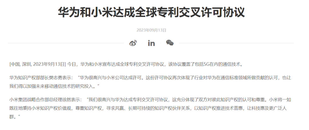 9月13日,华为和小米宣布达成全球专利交叉许可协议,该协议覆盖了包括5G在内的通信技术。