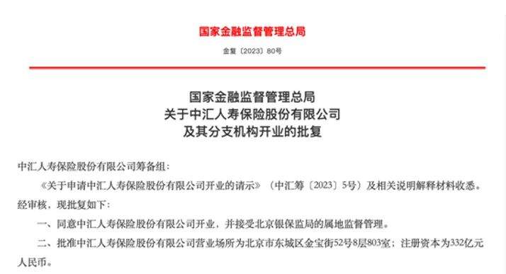 今年6月底,国家金融监督管理总局公布《关于中汇人寿保险股份有限公司及其分支机构开业的批复》,同意中汇人寿开业,并接受北京银保监局属地监督管理。