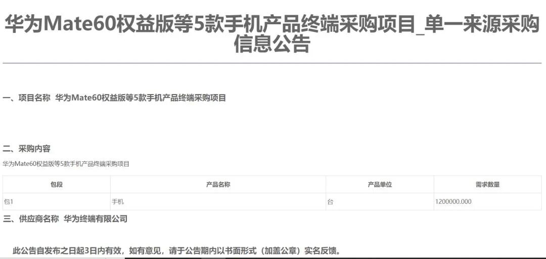 10月16日,记者在中国移动采购与招标网上看到,近日中国移动向华为采购了120万台手机,包括华为Mate 60权益版等5款产品。