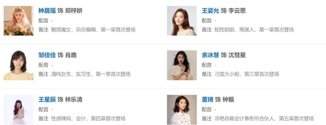 与以往的“乙女”类游戏中的二次元帅哥人物形象不同,该游戏中的六位女性为真人出演,且基本为专业演员或偶像。其中,冷艳总裁钟甄饰演者董琦是科班出身,曾参演过《中国合伙人》《道士下山》《八角笼中》等电影。饰演清纯女生肖鹿的邹佳佳来自女子偶像团体SNH48。魅惑魔女郑梓妍饰演者钟晨瑶主演的电影《二次呼吸》入围第七届平遥国际电影展“从山西出发”单元。