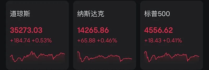 当地时间周三,美债收益率跌至2个月以来低点,美股三大指数小幅收涨。截至收盘,道指涨184.74点,涨幅为0.53%,报35273.03点;标普500指数涨18.43点,涨幅为0.41%,报4556.62点;纳指涨65.88点,涨幅为0.46%,报14265.86点。