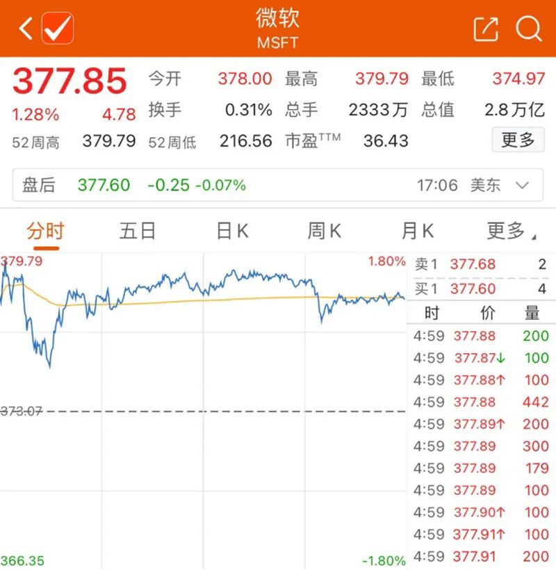 板块方面,美股科技股普涨,其中微软股价创收盘新高,报377.85美元,涨幅达1.28%,总市值2.8万亿美元。