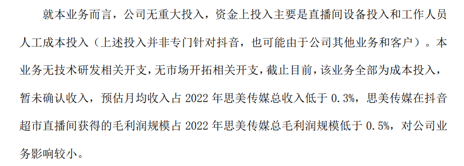 截至目前,该业务全部为成本投入,暂未确认收入,预估月均收入占2022年思美传媒总收入低于0.3%,思美传媒在抖音超市直播间获得的毛利润规模占2022年思美传媒总毛利润规模低于0.5%,对公司业务影响较小。