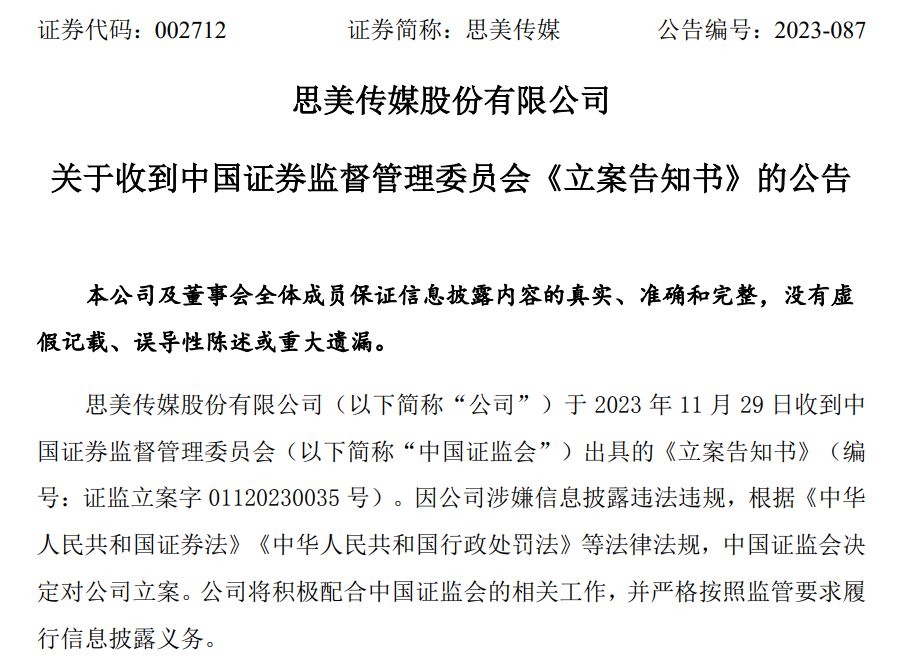 聚焦三:思美传媒:涉嫌信披违法违规 证监会决定对公司立案