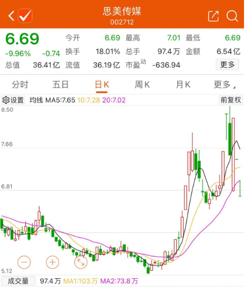事件反转后,思美传媒11月28日开盘就被封死在跌停板上。11月29日,思美传媒午后再度跌停,报收6.69元/股。