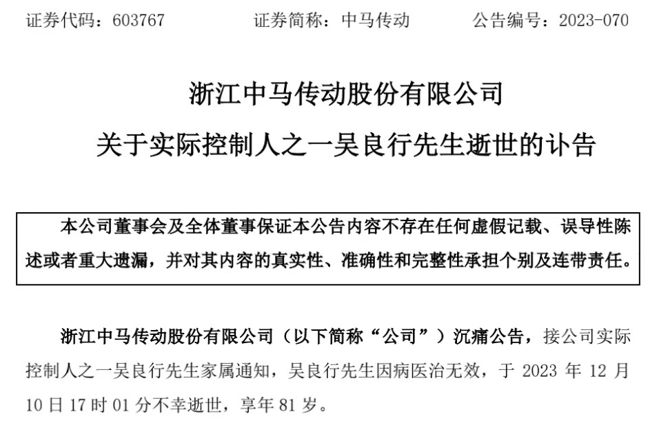 又一位典型的“草根浙商”不幸辞世。12月11日,中马传动发布讣告,公司实际控制人之一吴良行因病医治无效,于12月10日不幸逝世,享年81岁。
