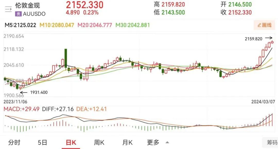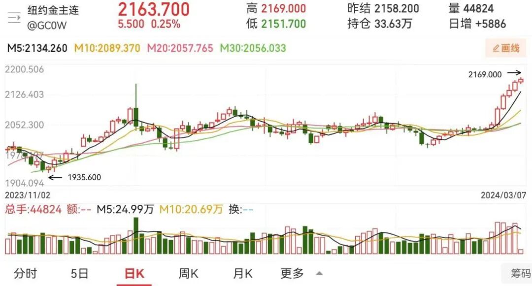数据显示,3月7日,纽约金主连盘中一度触及2169美元/盎司,伦敦金现盘中最高至2159.8美元/盎司,均刷新纪录。