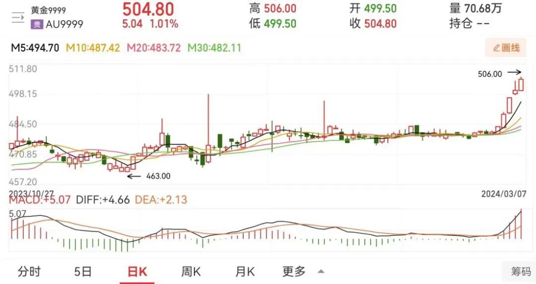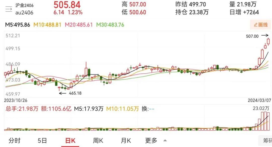 国内市场方面,沪金2406盘中一度涨至507元/克,截至3月7日14点左右报505.8元/克;上海黄金交易所的AU9999一度上探至506元/克,截至3月7日14点左右报504.8元/克,也均刷新纪录。