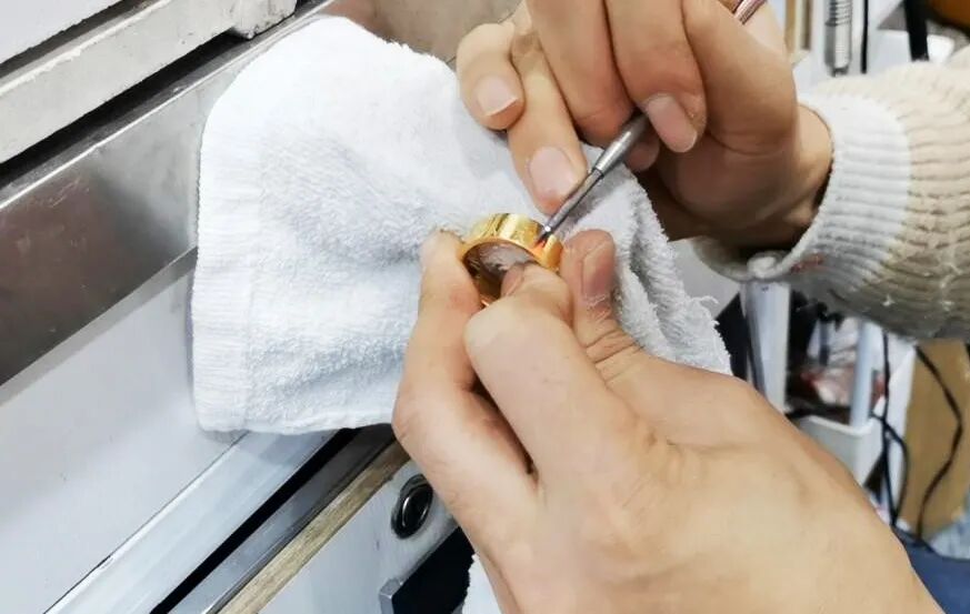 3月6日晚,上海一家打金店内,工作人员正为顾客打磨新戒指。曾庆怡摄