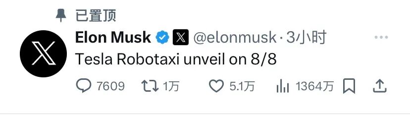 此后,北京时间4月6日凌晨,马斯克在社交媒体平台上发帖宣布:“特斯拉将在8月8日发布无人驾驶出租车产品。”消息公布后,特斯拉股价盘后上涨超3%。