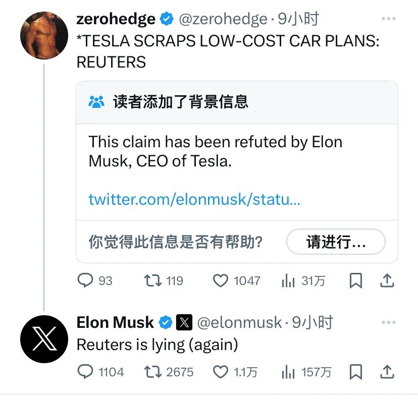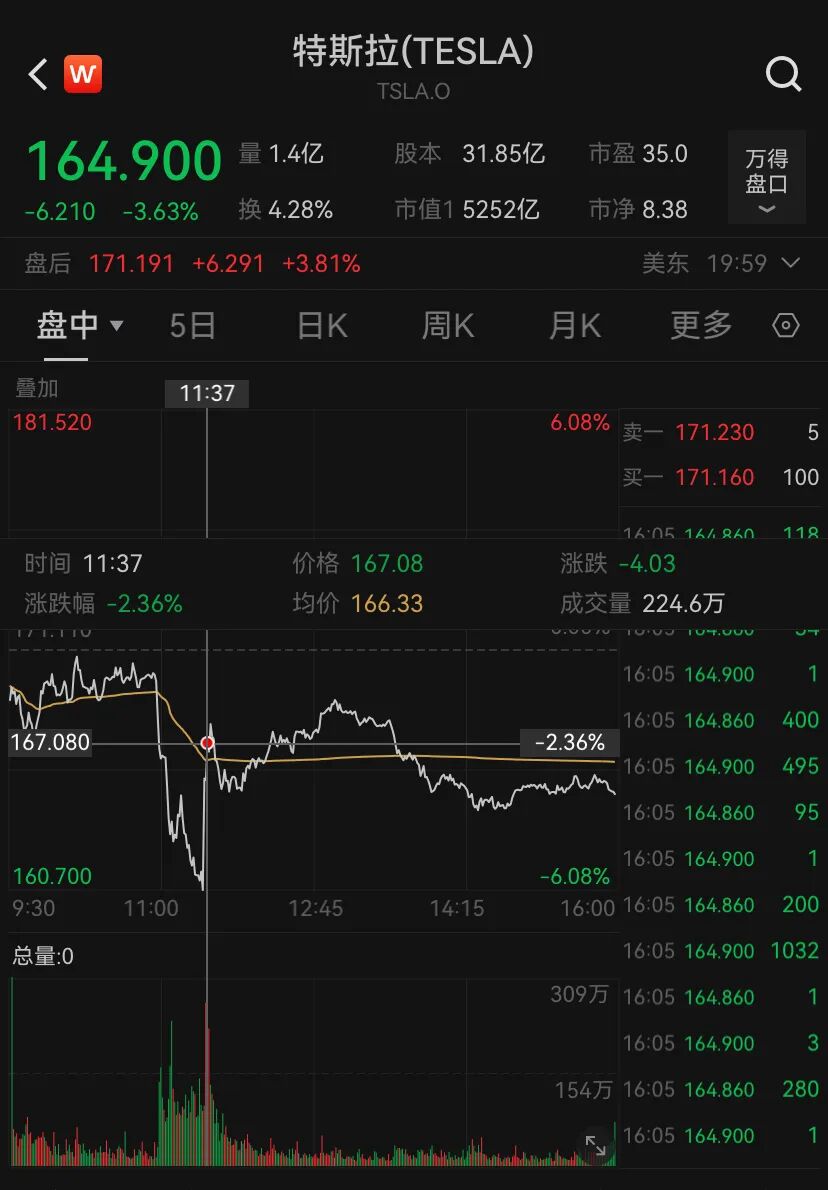 该报道发布后,特斯拉股价盘中一度跳水跌超6%。随后马斯克在社媒平台上发文称:“路透在撒谎”。截至收盘,特斯拉跌幅收窄至3.63%,报164.9美元。