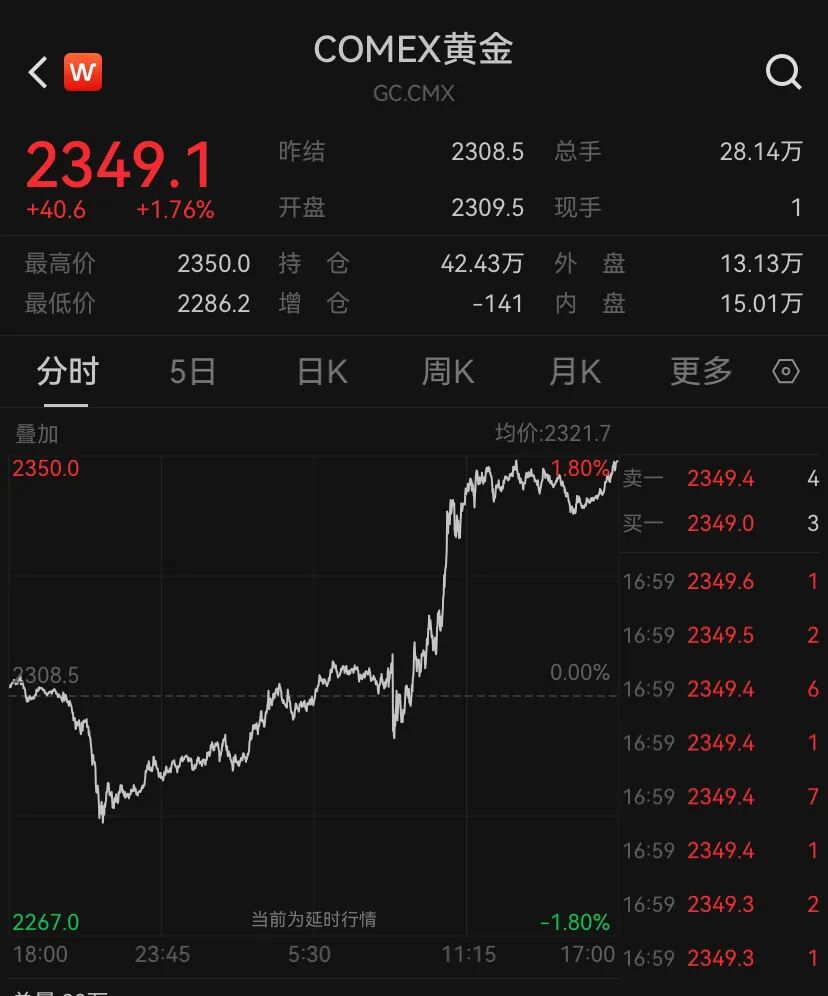 截至收盘,COMEX 6月黄金期货收涨1.76%,报2349.1美元/盎司,再创历史收盘新高。现货黄金同样再度冲高,盘中一度触及了2330美元/盎司的历史高点。本周国际金价涨幅超过4%,已连续第三周保持上涨态势。