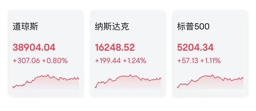 截至收盘,道指涨0.8%报38904.04点,标普500指数涨1.11%报5204.34点,纳指涨1.24%报16248.52点。本周全周,道指跌2.27%,标普500指数跌0.95%,纳指跌0.8%。