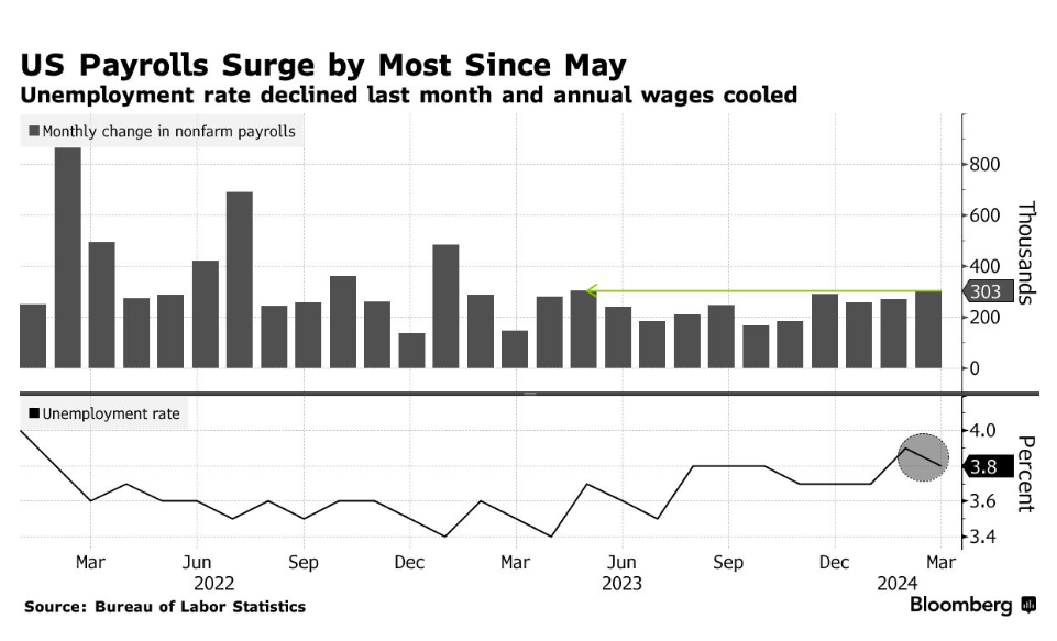 当地时间周五,美国金融市场迎来本月最为重磅的报告:非农就业数据。劳工统计局数据显示,美国的就业市场在3月份显示出强劲的增长势头,失业率略有下降,这也使得市场对美联储的降息预期再一次落空。