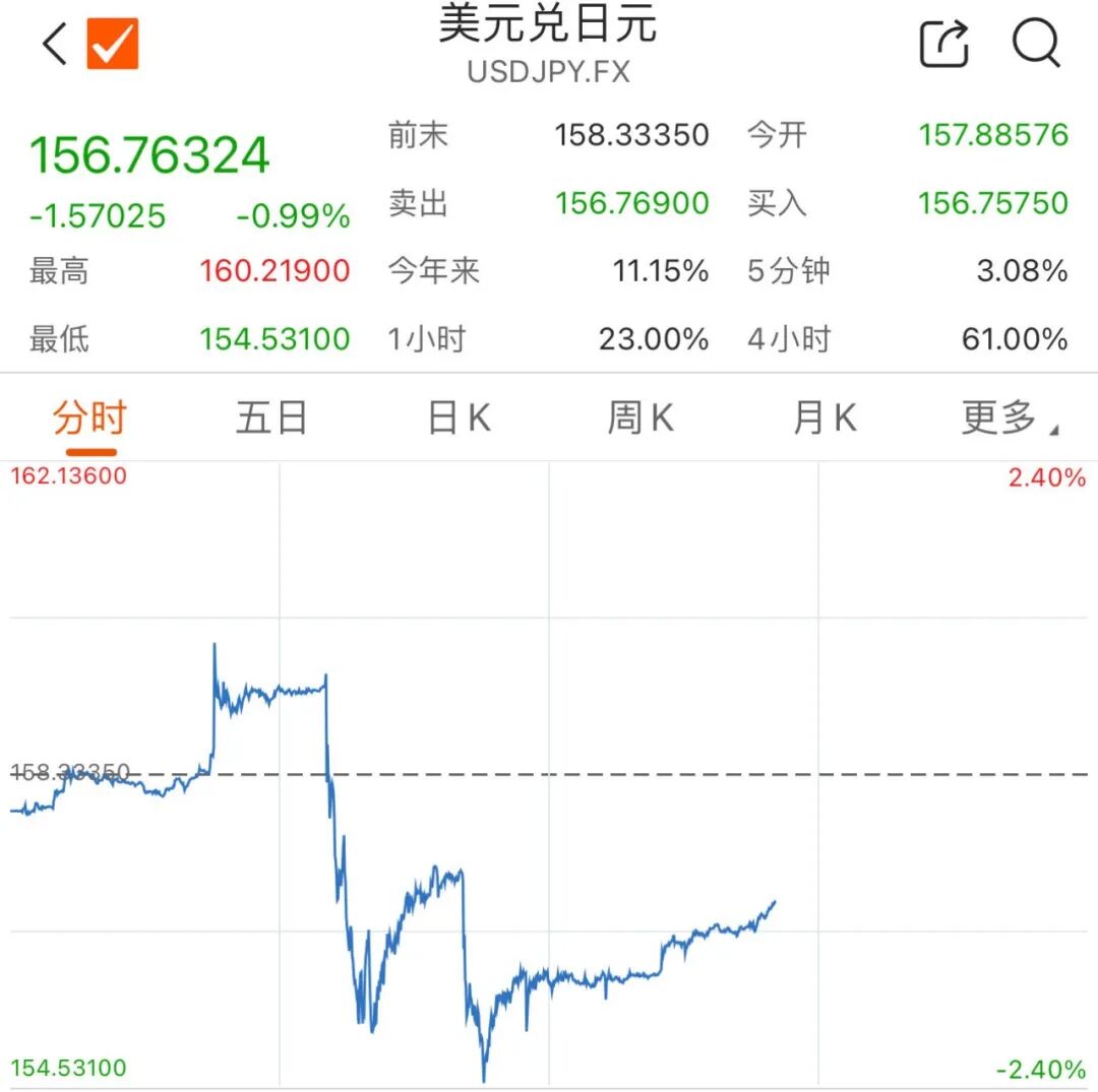 4月29日,日元上演罕见的“过山车”行情。亚洲早盘,日元汇率急跌后又快速拉升。日元对美元盘中一度跌破160关口,随后出现大逆转,日元午后暴涨超500点,陆续收复159、158、157、156、155五道整数关口。