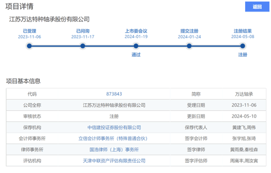 上证报记者注意到,北京证券交易所官网江苏万达特种轴承股份有限公司(下称“万达轴承”)的审核状态已变更为“注册”,更新日期为2024年5月10日。