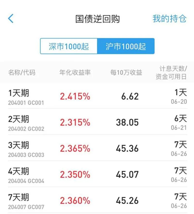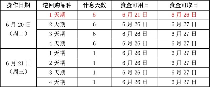 单从计息时间来看,目前端午假期前操作国债逆回购的最佳日期是明日(6月20日)。当日,投资者可以借出1天期逆回购(沪市逆回购简称GC001;深市逆回购简称R-001),就可以收获5天利息,资金在6月21日已可用。