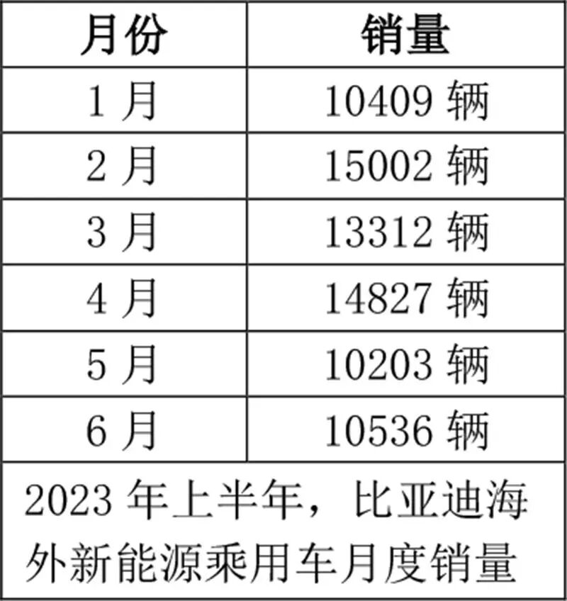2023年6月,比亚迪海外新能源乘用车销量10536辆。回顾2023年上半年,比亚迪海外新能源乘用车月度销量均在1万辆左右。