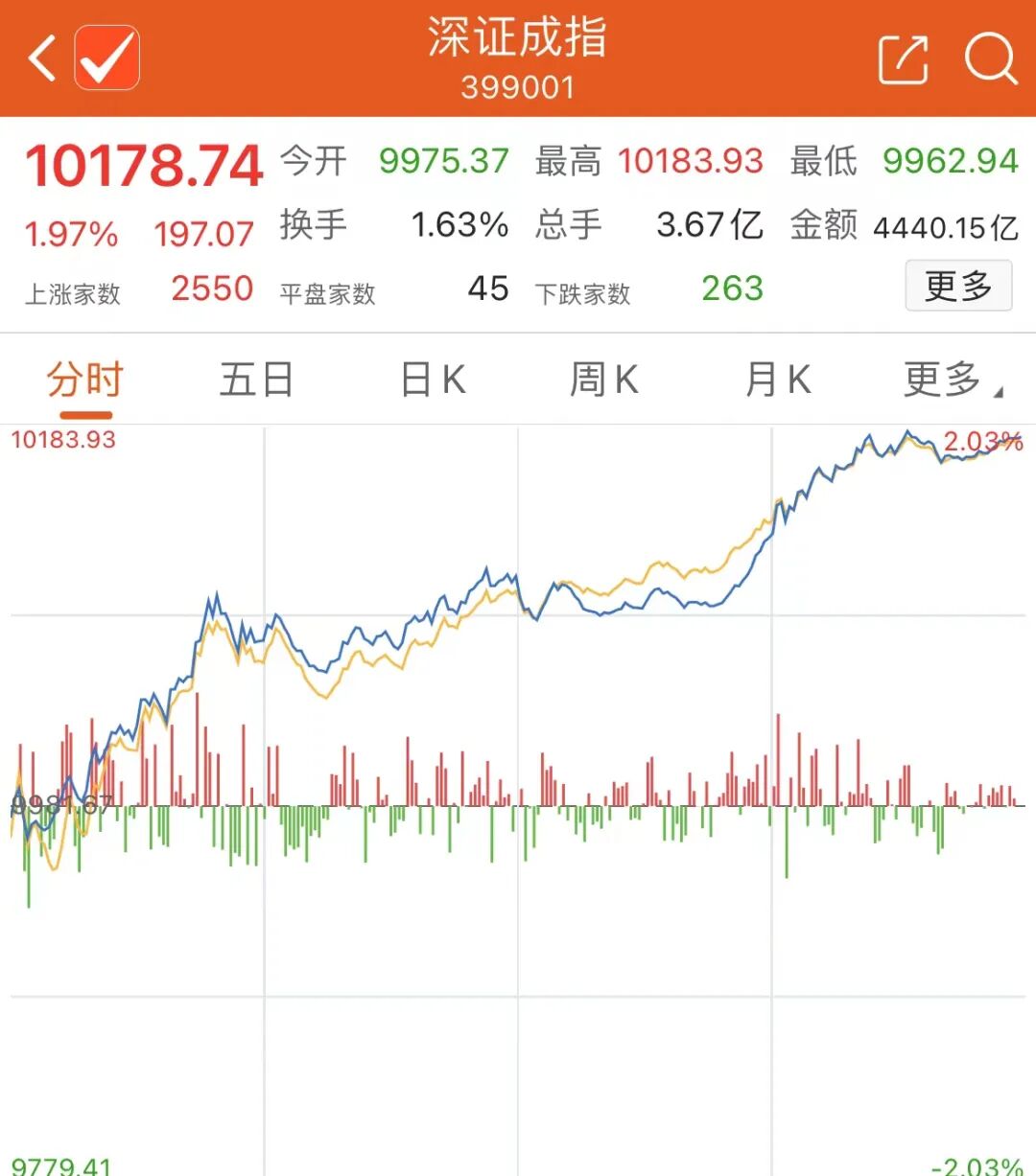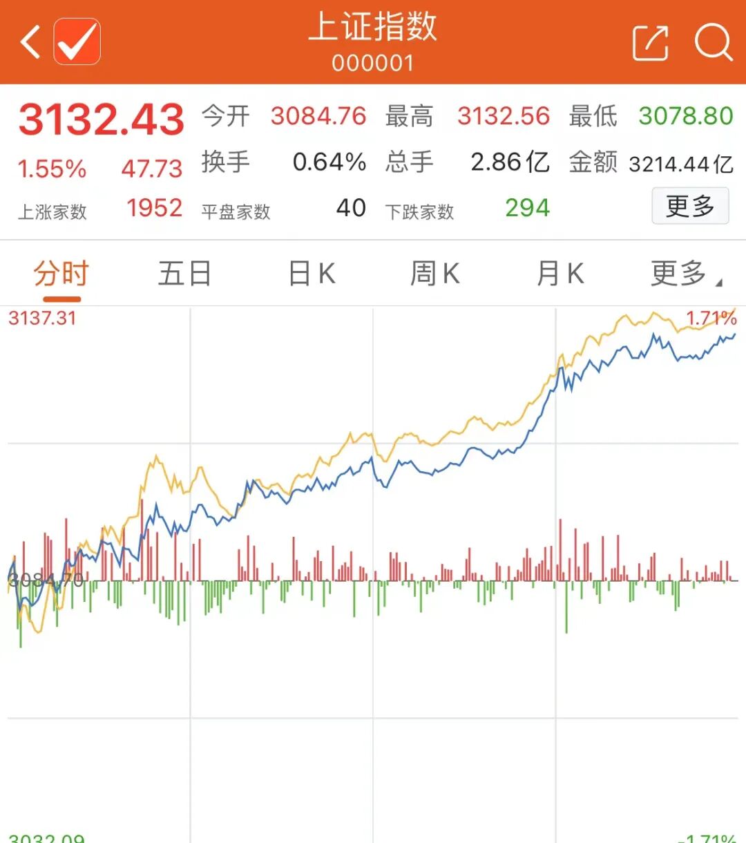 截至收盘,沪指涨1.55%报3132.43点,深成指涨1.97%报10178.74点,创业板指涨2.32%报2013.34点,上证50指数涨2.21%。两市合计成交7655亿元,较上一交易日放量1864亿元。北向资金全天净买入74.93亿元,终结连续3个交易日净卖出,其中沪股通净买入33.13亿元,深股通净买入41.79亿元。