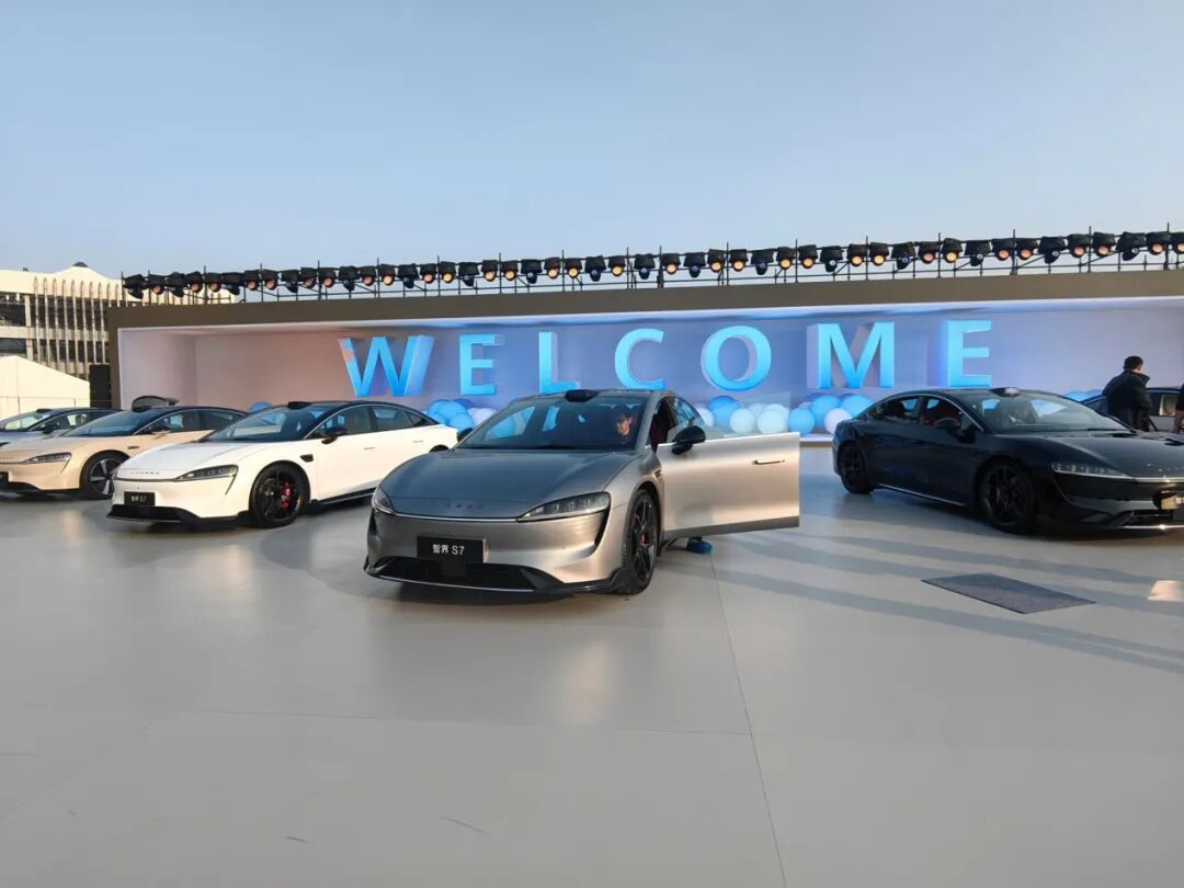 在户外展示的华为和奇瑞合作的智界S7新车和补能生态