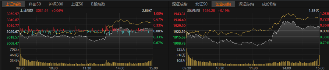 12月的首个交易日,沪深两市股指盘中震荡下探。午后,三大股指止跌回升。截至收盘,沪指涨0.06%,深证成指跌0.07%,创业板指涨0.19%。
