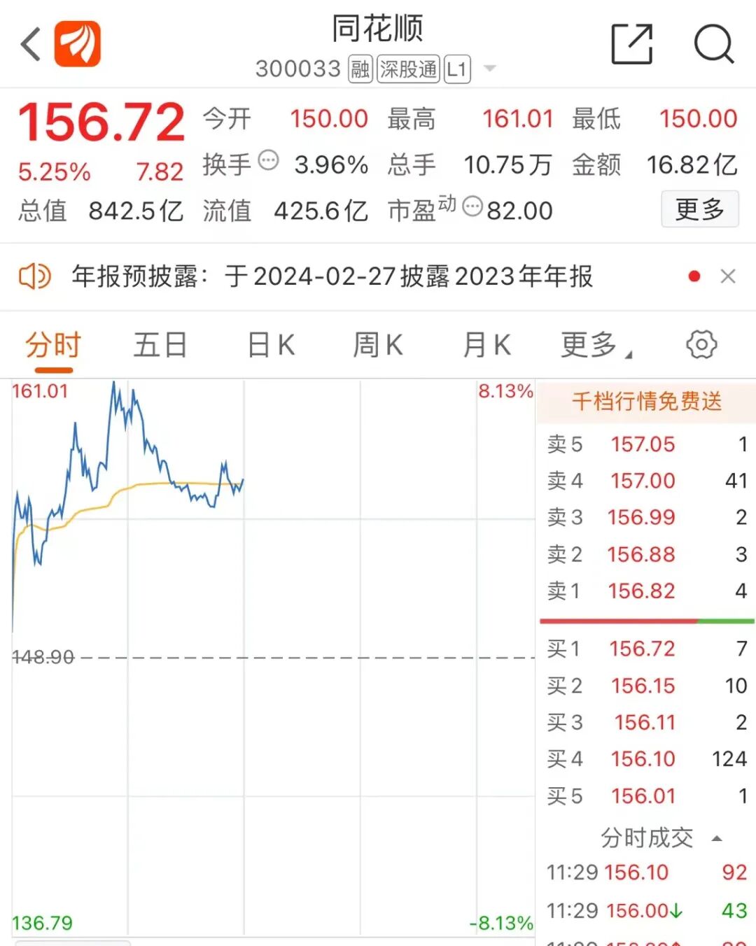 交易行情显示,同花顺1月8日高开高走,盘中一度涨超8%,触及161.01元/股的高点。截至午间收盘,同花顺涨5.25%,报156.72元/股。