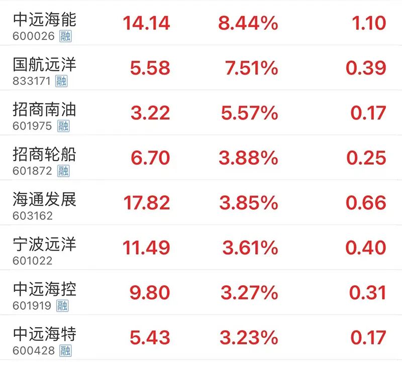 航运股今日早盘再度走强,中远海能盘中一度触及涨停。截至午间收盘,中远海能涨超8%,国航远洋、招商南油、招商轮船等涨幅居前。
