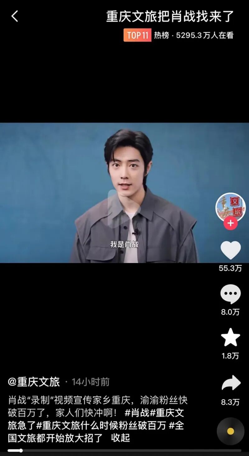 昨日,重庆文旅放出“大招”,邀请肖战为重庆录制宣传视频,助力家乡“C位出道”,该视频登上短视频平台热榜。肖战在宣传视频中介绍:“重庆是一个好山好水、来了就走不出去的漂亮的魔幻城市,欢迎大家来重庆旅游。”