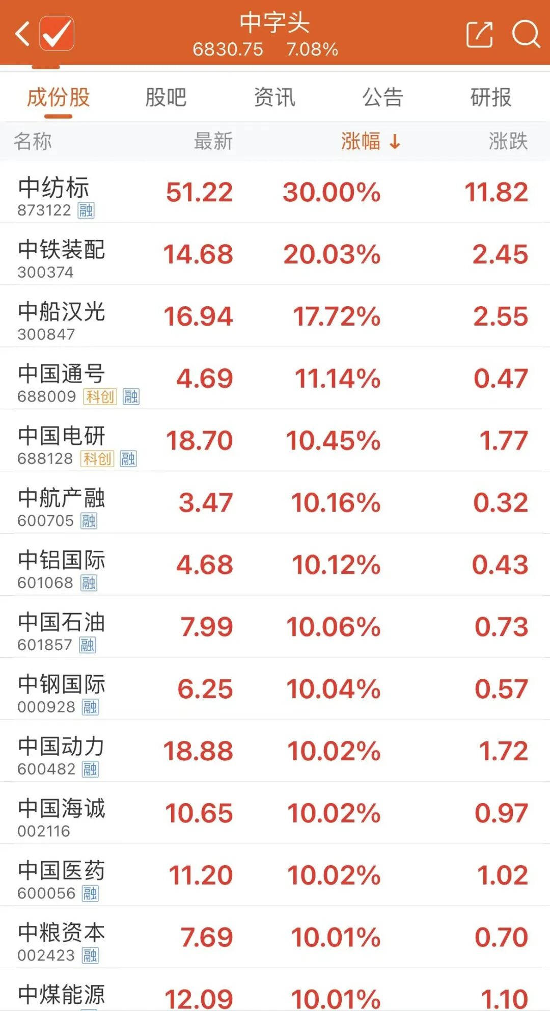 “中字头”掀起涨停潮,截至收盘,中纺标、中铁装配、中航产融等纷纷涨停。