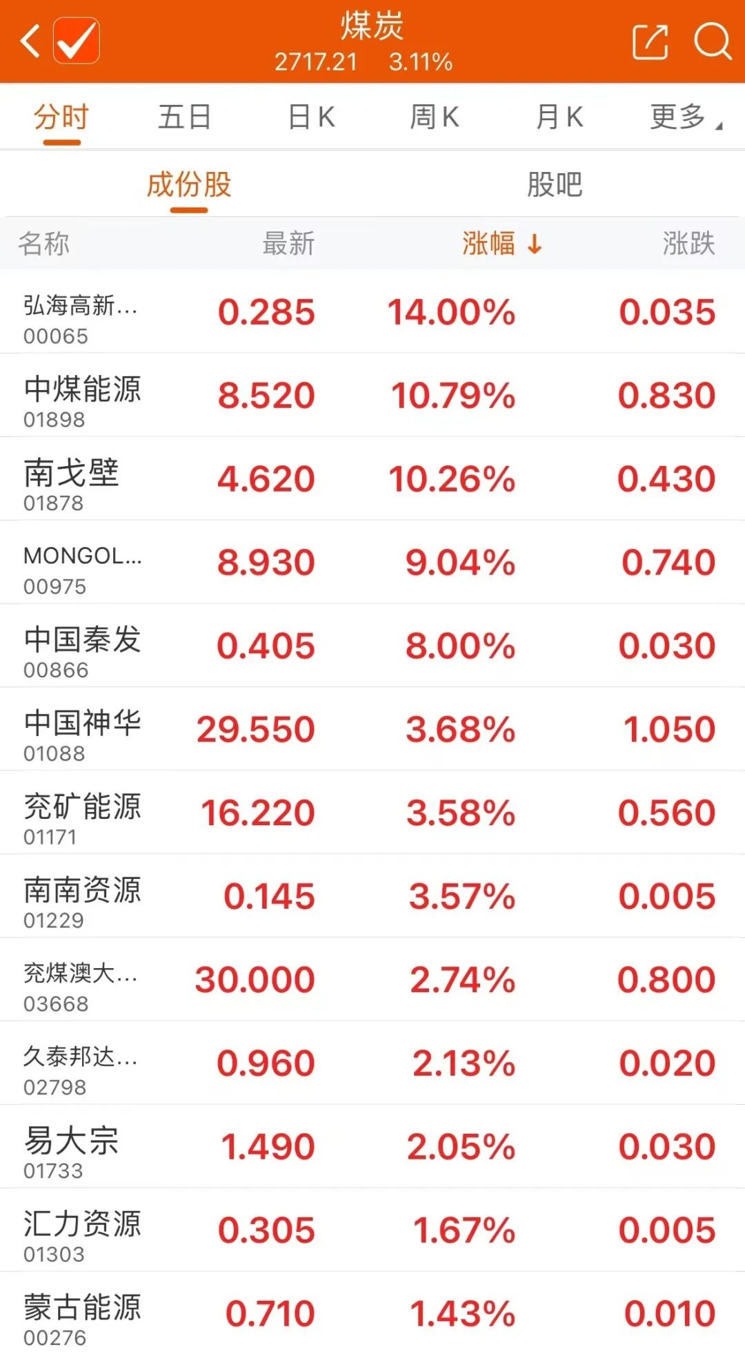 煤炭板块持续走高,中煤能源、上海能源等涨停,新集能源、辽宁能源等跟涨。