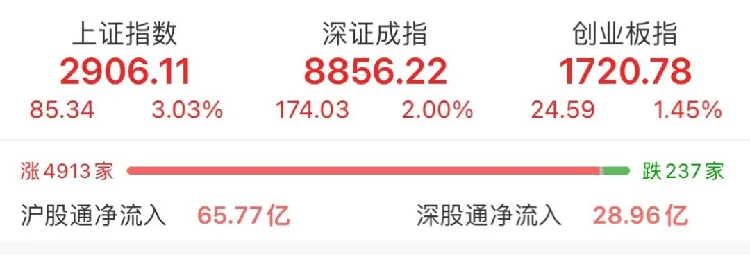 今日,上证指数重回2900点,涨3.03%;深证成指涨2%,创业板指涨1.45%。