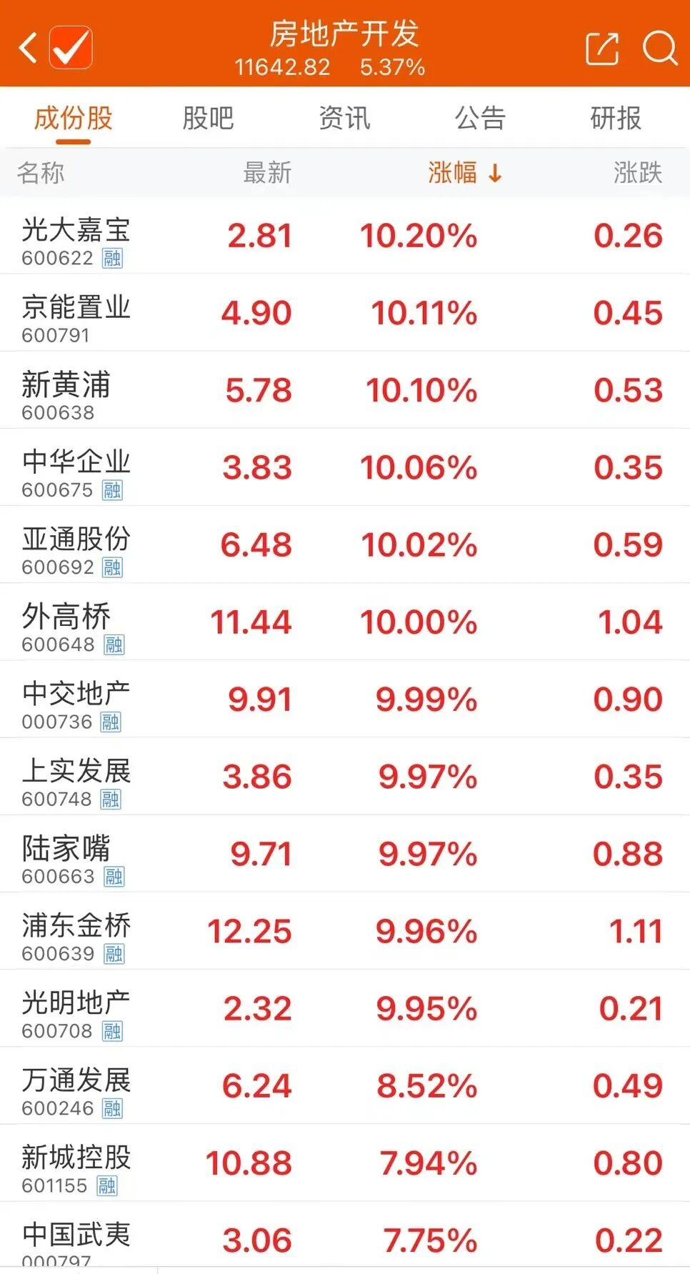 今日,地产产业链也大涨,房地产开发、建筑装饰、物业管理等板块涨幅居前。房地产开发板块中,光大嘉宝、新黄浦等涨停。
