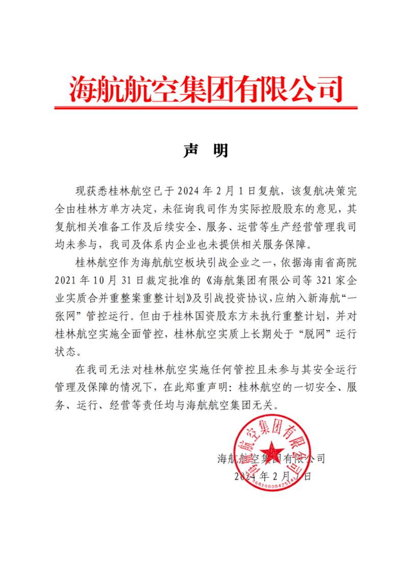 2月7日凌晨,海航航空集团发布声明称,现获悉桂林航空已于2024年2月1日复航,该复航决策完全由桂林方单方决定,未征询公司作为实际控股股东的意见,其复航相关准备工作及后续安全、服务、运营等生产经营管理公司均未参与,公司及体系内企业也未提供相关服务保障。