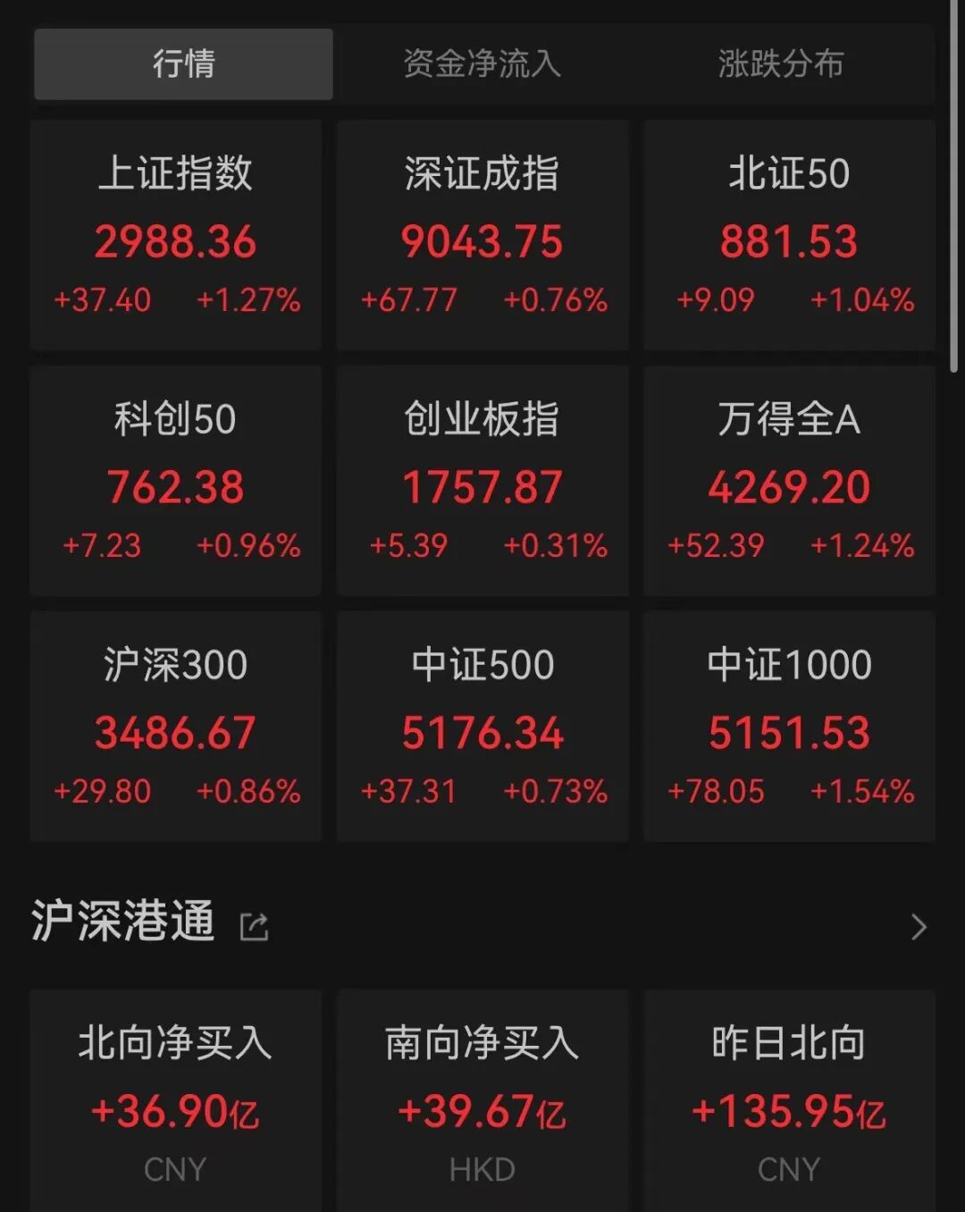 周四,A股三大指数低开后震荡走强,沪指强势录得七连阳,收盘接近3000点。截至收盘,上证指数涨1.27%,深证成指涨0.76%,创业板指涨0.31%。沪深两市合计成交额为8224亿元。北向资金全天净买入36.90亿元,为连续两个交易日呈净买入态势。