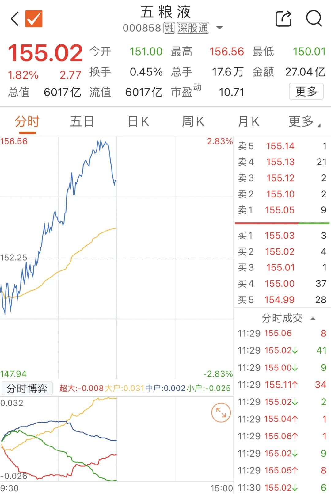 截至午间收盘,五粮液涨1.82%,报155.02元/股。