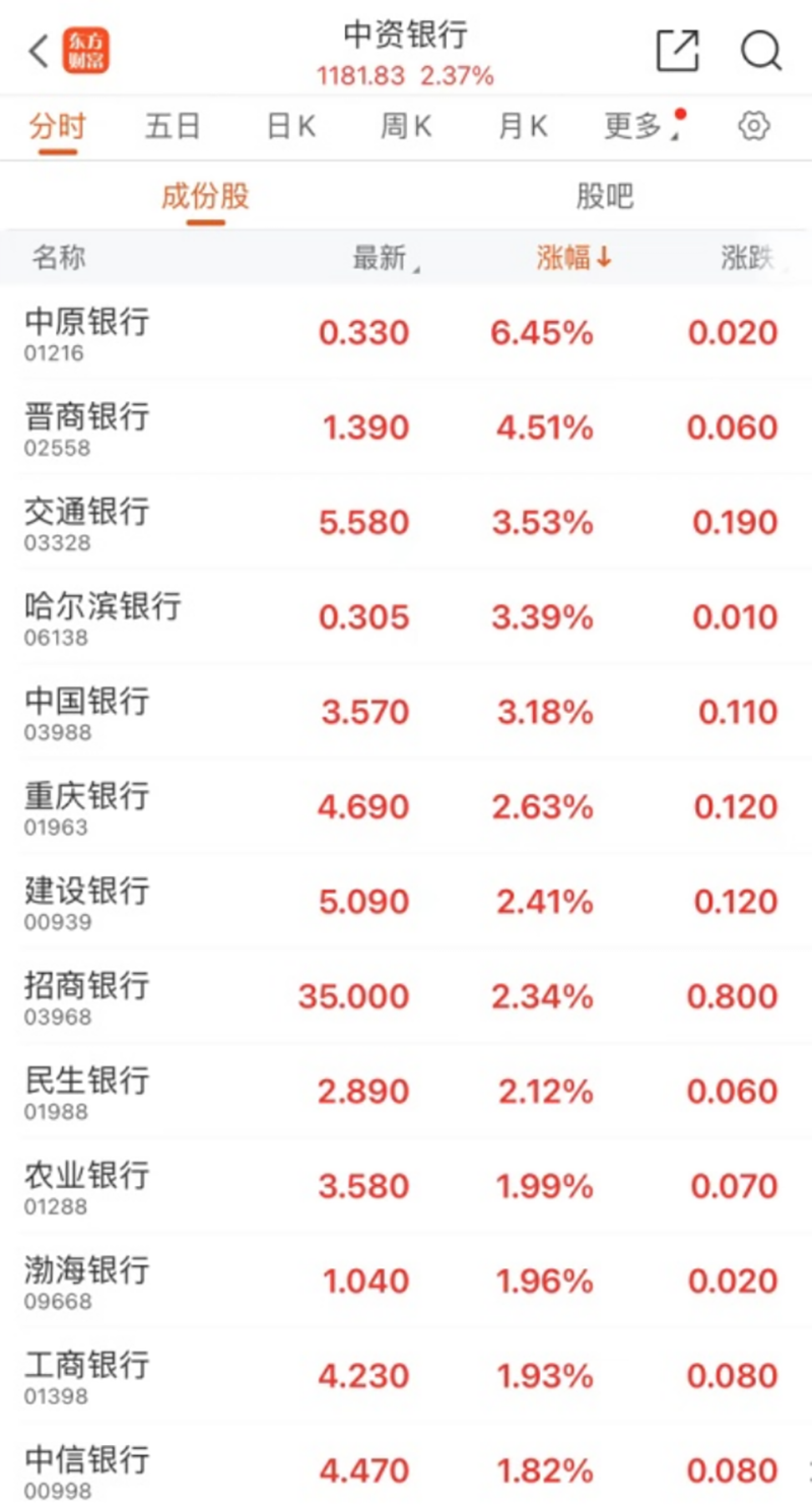 港股银行板块震荡拉升,中原银行涨超6%,晋商银行涨超4%,交通银行、哈尔滨银行、中国银河涨超3%。