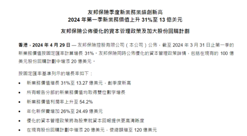 4月29日,公司公布第一季度新业务摘要。其中,按固定汇率计算,新业务价值达到13.27亿美元,同比增长31%,创下季度新高。友邦保险宣布将增加股票回购计划,规模达20亿美元,总额增至120亿美元。业内人士认为,这一回购计划显示了公司对自身前景的信心,并可能有助于提升股价。